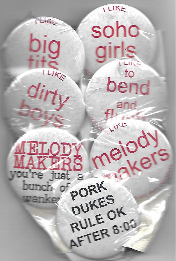 These Vintage Punk Pins By the Pork Dukes  were originally from the their first LP Pink Pork ! they were sold separett . Now you can get them in 2 sets at a better Price. So get your set today remember That the Pork Dukes rule ok after 8!